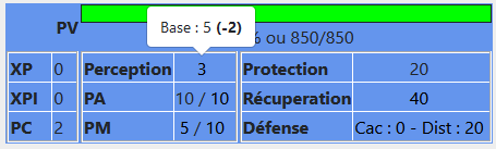 Par exemple, vous avez un malus de 2 points de perception en forêt (mais un bonus de défense aux attaques à ditance de 20) :