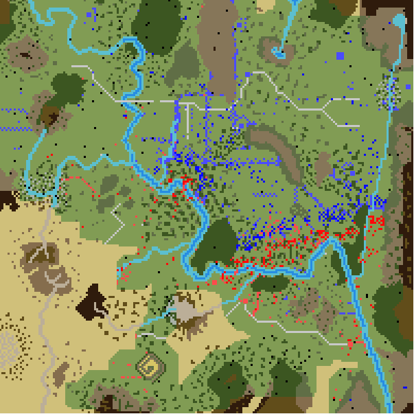 Les personnages et infrastructures sont représentés en bleu pour le Nord et en rougepour le Sud.